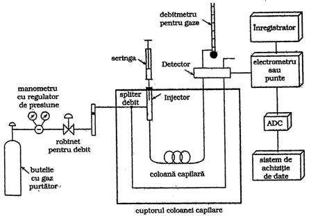 Utilizarea coloanelor capilare care necesita volume de proba foarte mici, de aproximativ 10-3l a impus utilizarea sistemului de injectie cu splitare. Astfel, in coloana cromatografica se introduce o fractie stabilita din proba, restul este indepartat.
