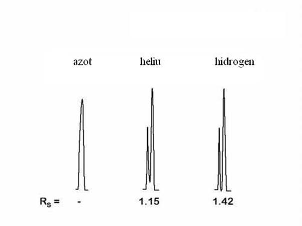 Alegerea tipului de gaz purtator influenteaza rezolutia asa cum se vede din figura 3. Astfel, in cazul utilizarii azotului drept gaz purtator, cei doi compusi nu sunt separati, rezolutia creste odata cu utilizarea heliului si este foarte buna in cazul utilizarii hidrogenului drept gaz de transport.