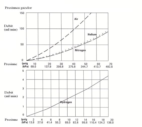 In figura 2 este prezentata relatia dintre viteza de curgere functie de tipul de gaz purtator utilizat. Determinarile au fost efectuate utilizand aceeasi coloana si aceeasi proba.